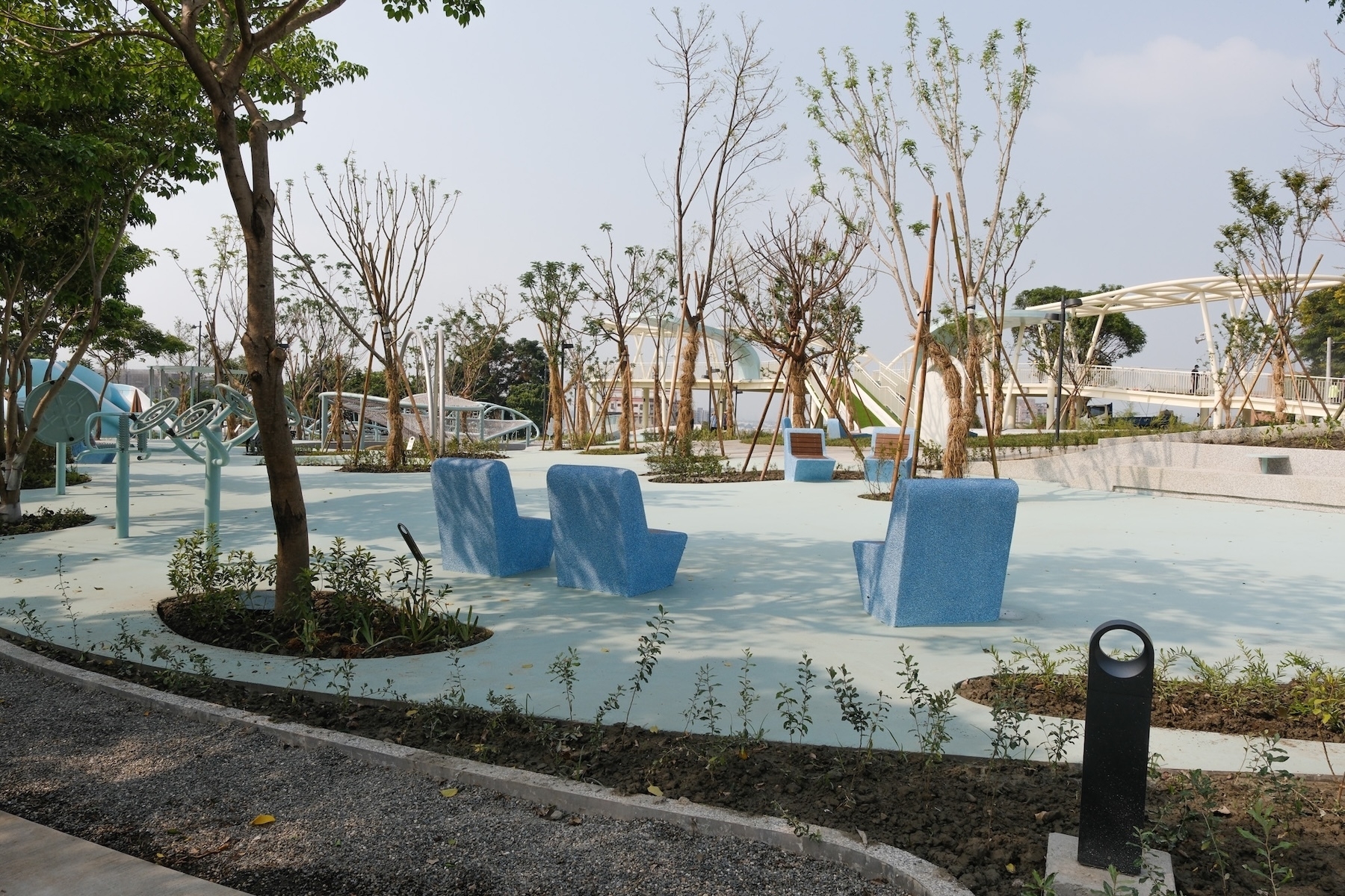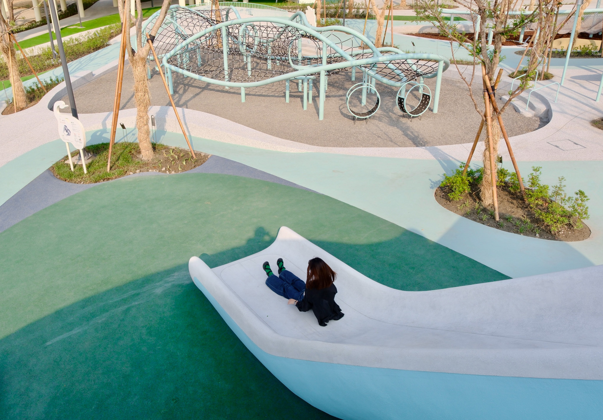 The turquoise pavement glimmers under sunlight, and the curved play structures ripple like moving clouds. Seen from afar, the site resembles a mountaintop artwork — a joyful playground that has become a new landmark for Changhua.