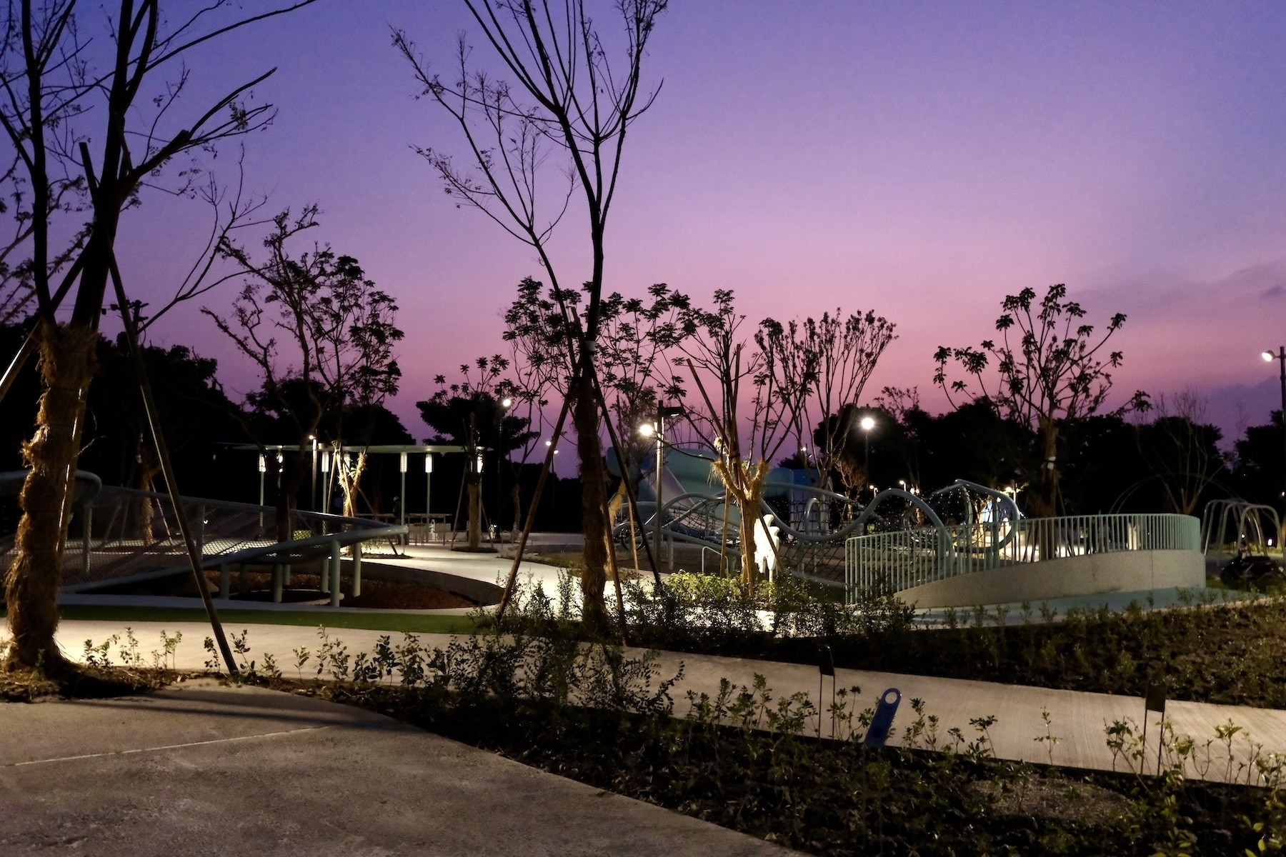 The park features 73 native tree and shrub species, creating a lush green environment by day. At night, 3000K warm-tone lighting casts gentle layers of illumination, turning the playground into a glowing piece of public art.