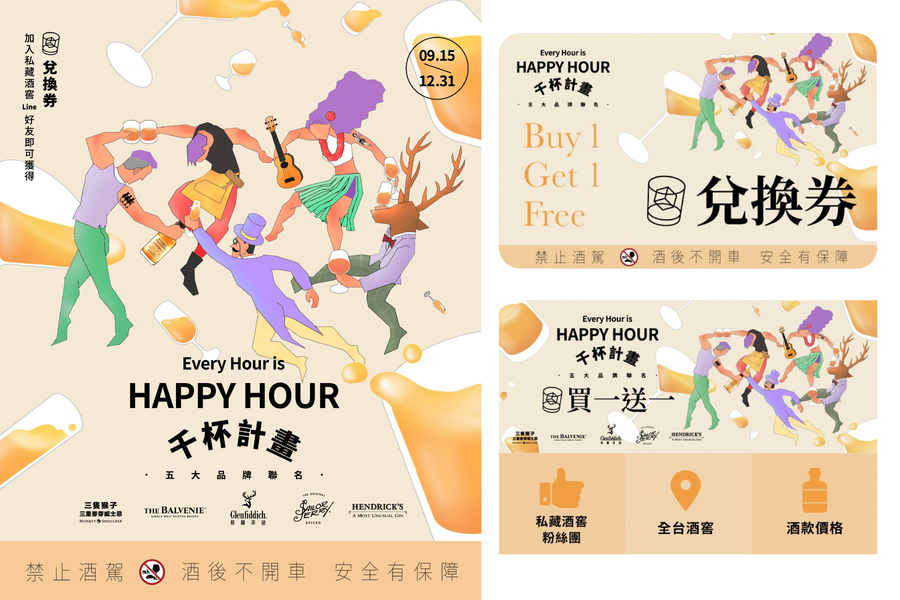 本次千杯計畫特別聯手格蘭父子旗下五大烈酒品牌,包含百富、格蘭菲迪、三隻猴子、亨利爵士琴酒、以及傑瑞水手蘭姆酒,網羅6款熱銷烈酒產品加入千杯計畫行列。本公司為千杯計畫提供主視覺設計,包含靜態主視覺、動態主視覺、社群行銷圖文排版等廣告素材設計。