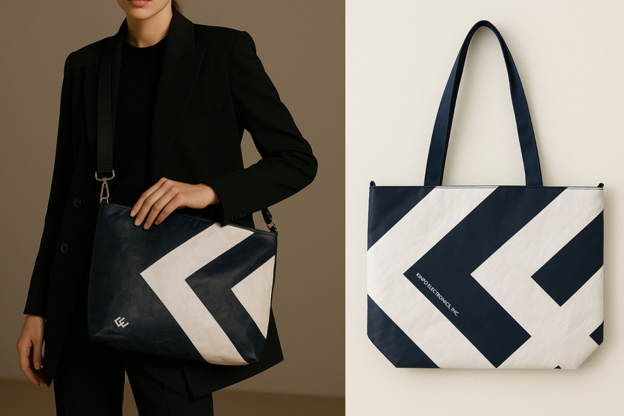 結合永續理念進行金寶電子股東會紀念品設計。與優質台灣廠商合作,提供產品方案、設計、製造生產、品管、包裝的完整服務。本托特包選用杜邦紙製作,兼具輕量、耐用、可回收等特性。並使用GRS認證再生塑膠材料製成包裝袋,貫徹企業的永續理念與社會責任。