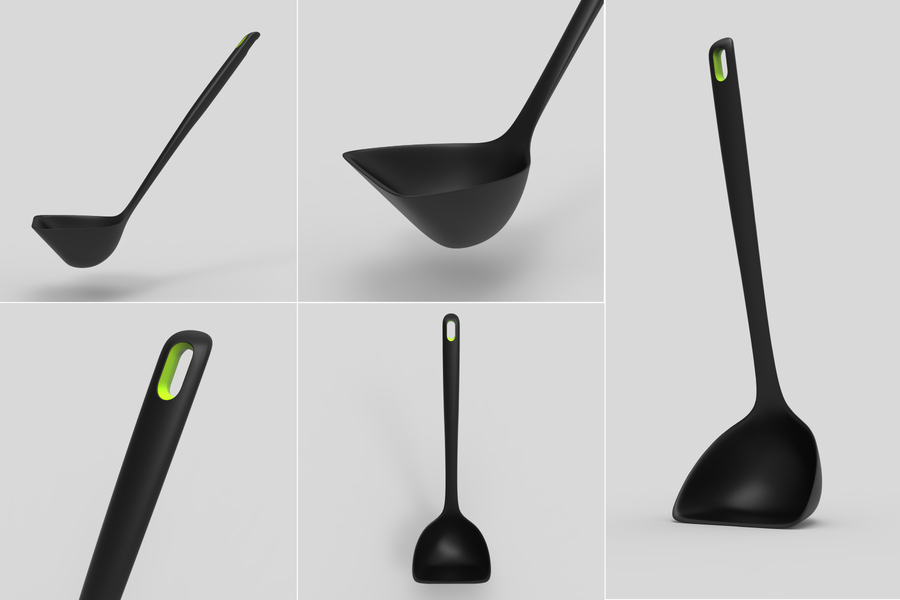 本產品優化人因設計、藉由勺面輪廓改善湯勺與湯鍋底部的密合度,並藉由重心模擬使其能夠自行站立節省桌面空間。以深灰為基底,搭配功能提示色,傳達專業與高效感,讓消費者一眼理解「更快、更好、更省力」的使用價值。