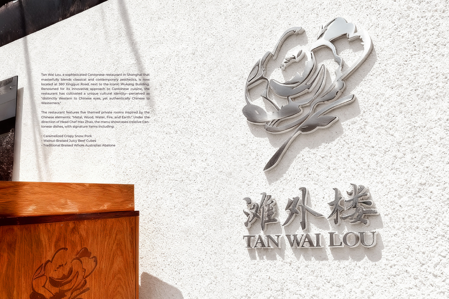 本案為以粵菜為主軸,融合川菜與寧波菜風味的中式餐廳。主廚以「簡約、大氣」為理念,結合全球食材與西式擺盤,展現新世代的灘外樓風格。設計融入象徵繁盛的牡丹花意象,延續「灘外有樓,海上生花」的詩意,以優雅細膩的視覺語彙詮釋當代中式美學。