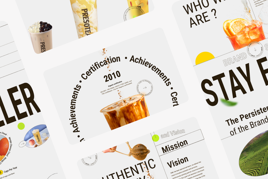 白質設計協助鮮茶道在美國市場重新建立品牌認知,我們以「互動式品牌體驗」打造全新官網。首頁以飲品選擇作為進站互動體驗,讓使用者以沉浸方式感受 Presotea網站大量運用動態元素,呈現“Fresh & Active”的國際化形象,並以系統化內容重塑品牌敘事,包括品牌DNA、技術優勢、產地故事與主打飲品。整體設計提升品牌專業度與辨識度,成為鮮茶道拓展北美市場的重要品牌入口。