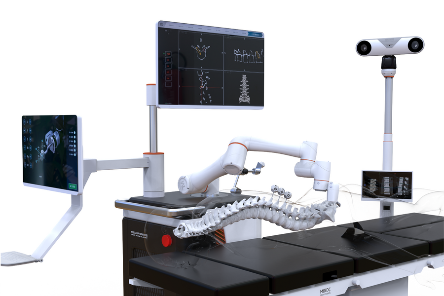 智慧多椎節手術輔助系統整合3D光學定位、手術導航與機械手臂,提升手術效率與醫療品質。簡潔懸臂設計,搭配折面造型,展現輕巧靈活形象,突破傳統醫療器材笨重刻板印象,強化專業感與品牌辨識度。