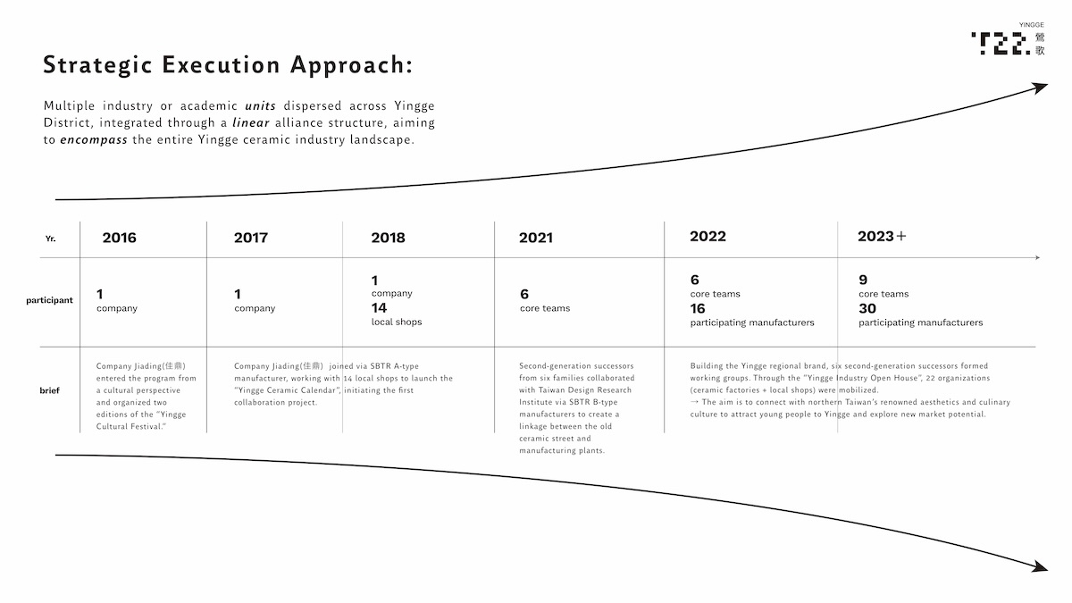 自2019年起導入鶯歌,透過產地學院、跨界合作、見學行動建立信任,引導業者組成「陶次瓦代代合作會」,再透過開放日、商品聯名對外連結,導入自立營運模式並擴大國際合作。