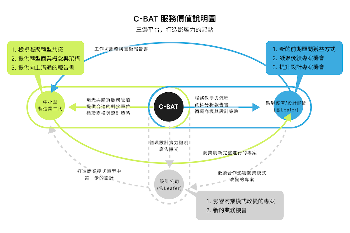 - 產業效益:提供設計人才轉型途徑:本計畫服務將參照循環台灣基金會,有完整的引導師培訓指南,其中將公開招募設計人才,並培訓相關技巧與理解循環經濟及其中設計方法。