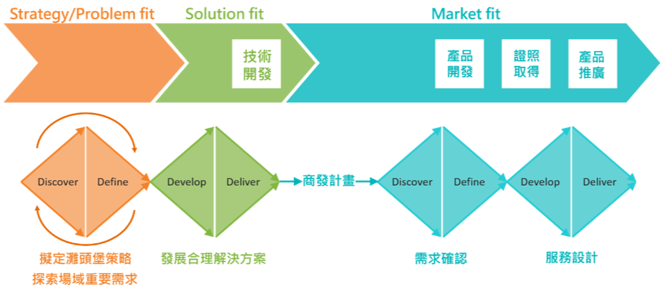 導入方法 宏碁智醫與台大智活合作,導入設計思考研發流程,此模式以設計思考的「發散」與「收斂」雙鑽石模型為架構,將智慧醫療創新流程分為三大階段: