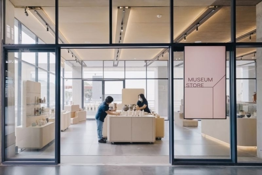 在商店空間上,以窯燒「煉土」時循序漸進的色溫做為概念,增添了櫃體及天花顏色上的層次感,也強化陶瓷的特質和形象,並在商店品牌「MUSEUM STORE」的英文字母上加入陶器「圈足」結構概念,類比展示台上的立足物器。除外,重新規劃商品陳列方式及選品內容,將商品將分為實驗展演、素材紋理、生活家飾和觀點選物四大區域,增強每個區域的特色和豐富性,建立陶博館在陶瓷領域裡的代表性及話語權。