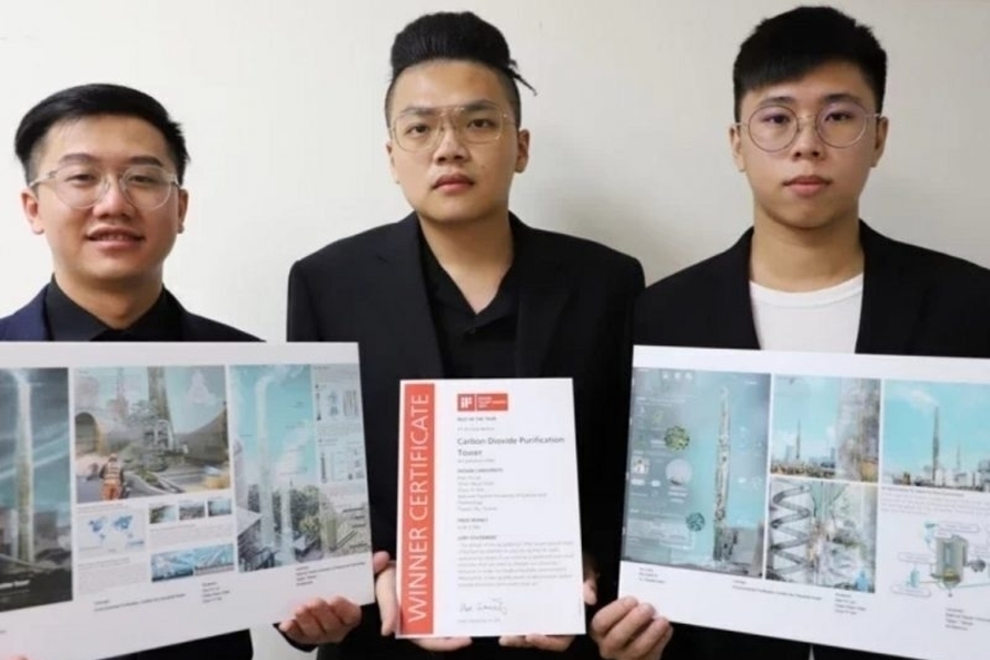 ▲ 台科大建築系學生陳建勳、賴翰宇、葉俊毅設計的「碳捕集淨化塔」,獲得德國iF設計獎年度大獎。