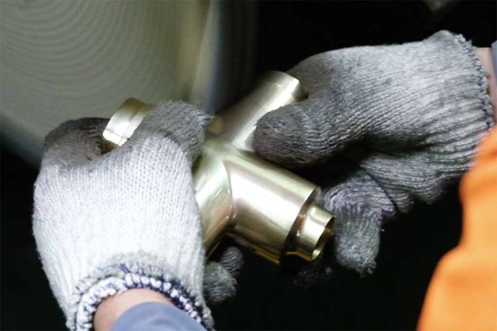 負責整合設計想法、提供製造建議的設計總監黃亭耀向我們解釋,通常大樓冷熱水管線會分開從壁面出來,但是 YES 系列壁式龍頭為了讓進水端看起來只有一管,除了使用創新的閥體,也搭配變形的零件與不同加工法,將需要的零件都塞進同一處。看似一體成型的部分,其實是由好幾節接合在一起,並靠著表面拋光電鍍修飾,十分考驗現場師傅們的功力與細心。