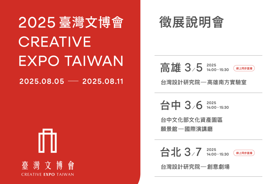 「臺灣文博會」為協助品牌業者、創作者了解參展效益,將於高雄、台中、台北辦理徵展說明會 ,於會中將說明「展區規劃、徵展類型、收費與報名機制」等,歡迎國內文創、IP相關業者、新銳 創作者及新創公司踴躍報名!