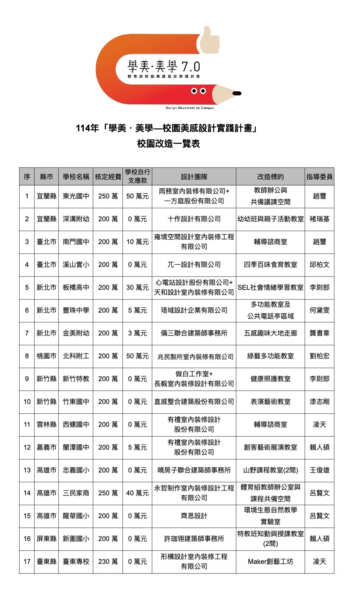 114年度教育部「學美.美學—校園美感設計實踐計畫」 設計提案評選結果公告!