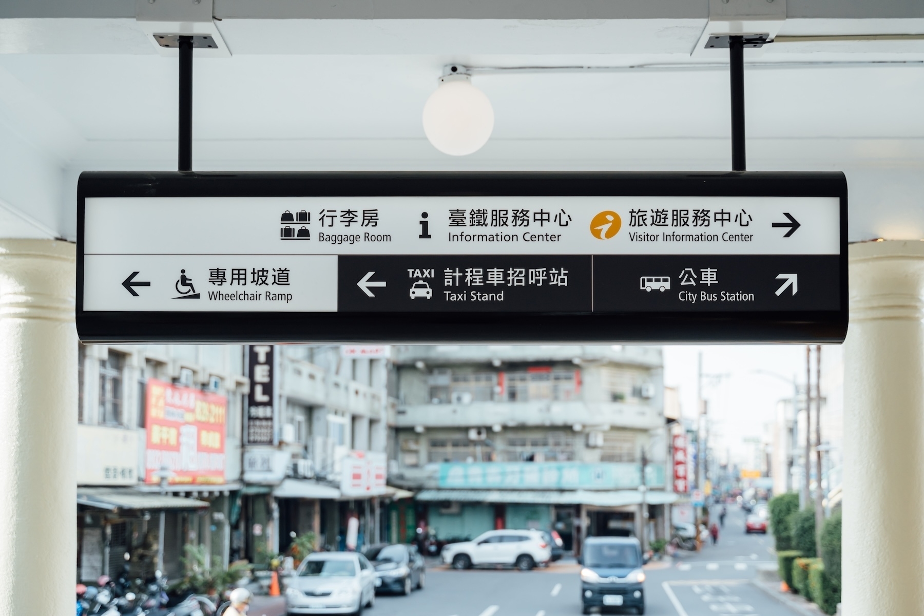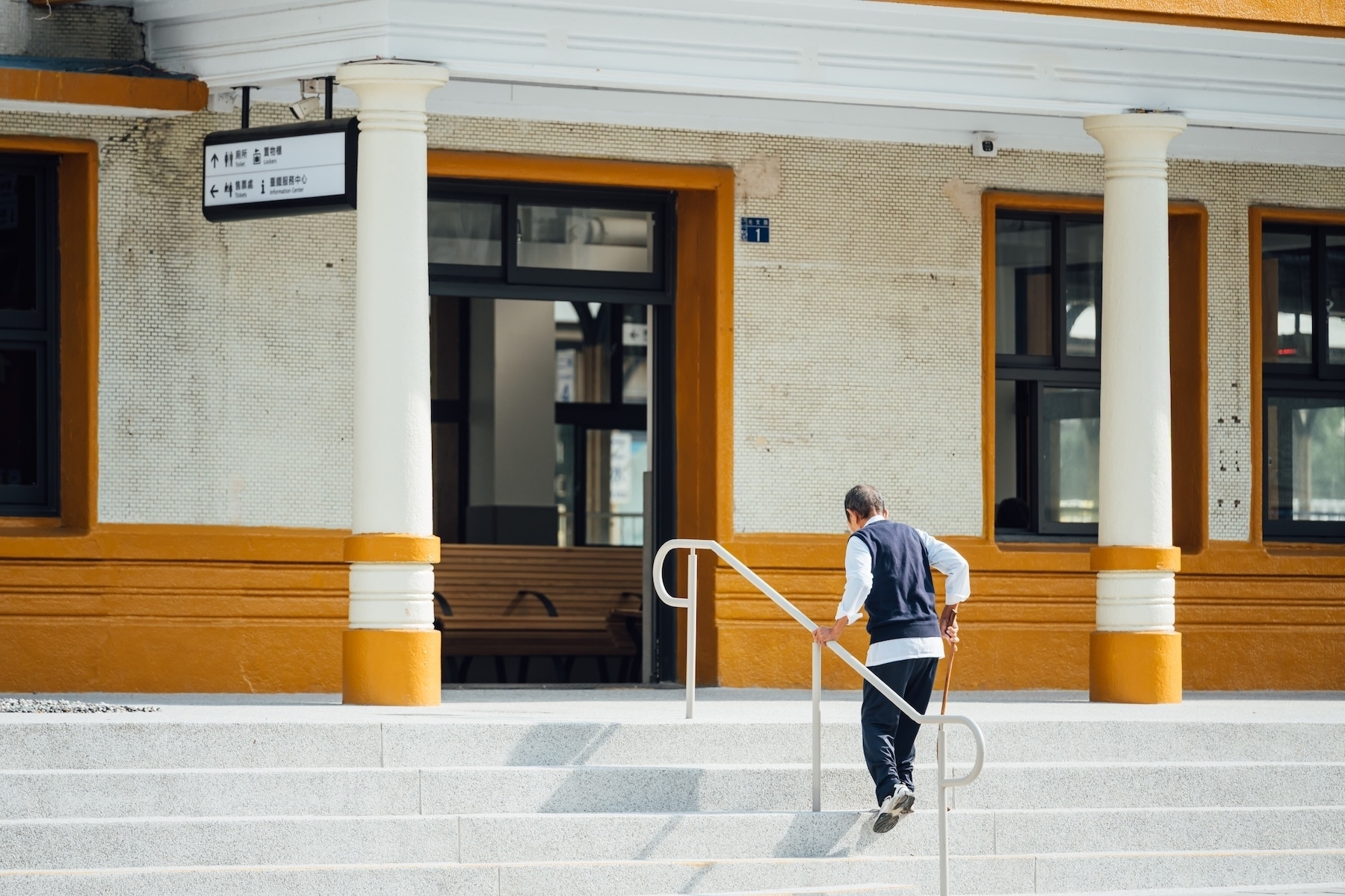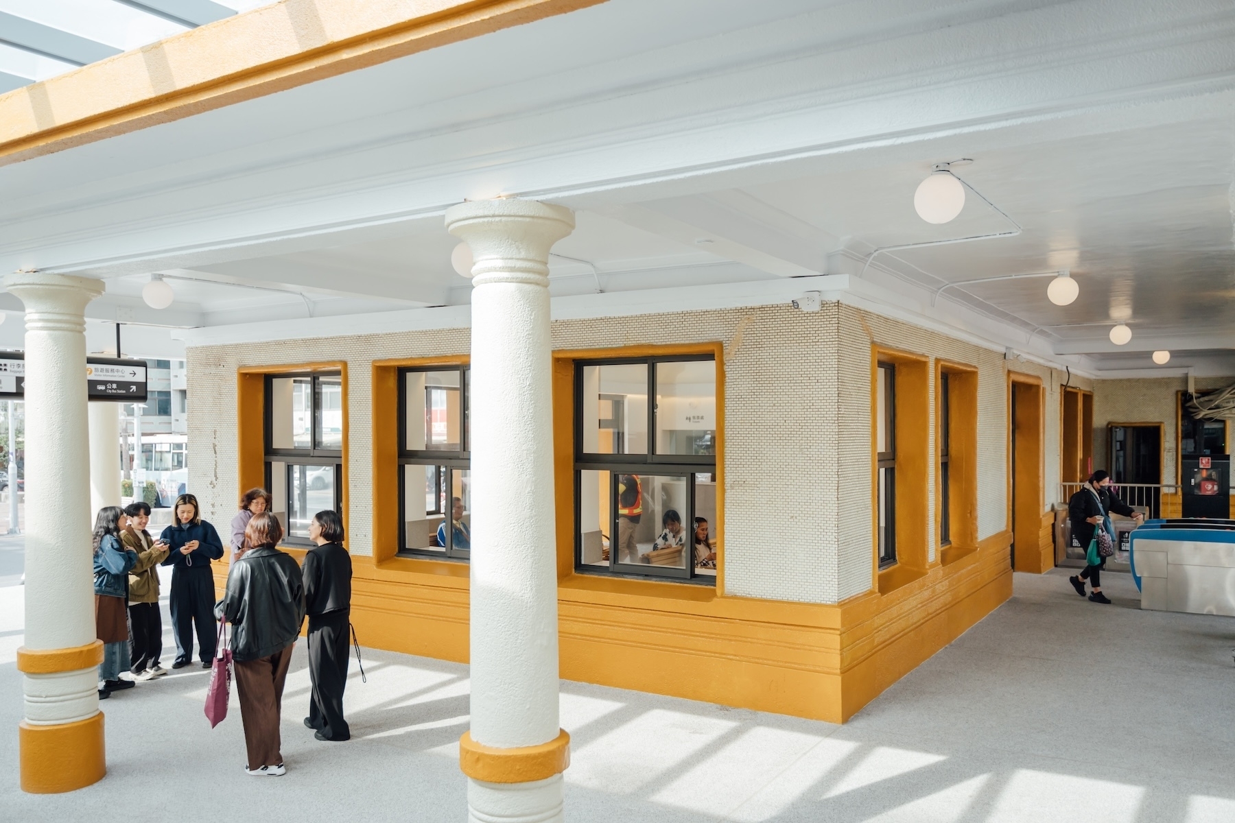 建築立面原有的 ATM 機、公告欄與地面的花圃,也被重新調整配置。這樣的「減法」不只是視覺簡化,更回應實際使用需求:讓輪椅族、拖行李的旅客,以及牽行或騎乘腳踏車進出站體的使用者,都能享有更順暢、安全的通行動線,同時也還給車站一個寬敞、舒適的入口門面。