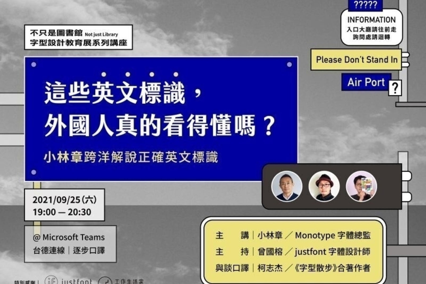 本活動邀請到Monotype字體總監小林章跨洋線上分享。不論你是對英文標識設計到好奇,或者是設計相關科系學生、設計領域工作者,以及從事公共空間、私人場域規劃管理、觀光相關工作者,邀請你一同深度理解英文標識使用方式,從細節到整體全面掌握,將大幅增進你的設計力與鑑賞力!