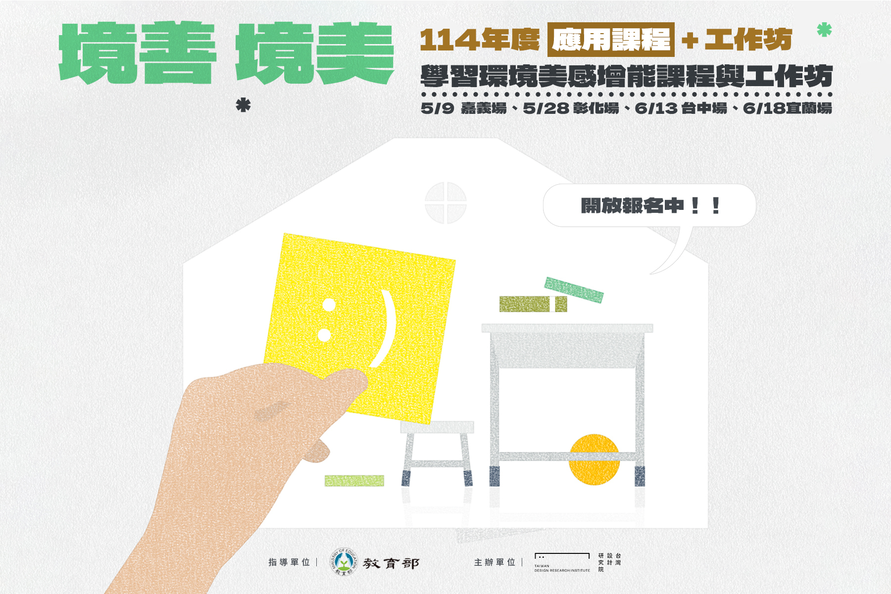 廣受好評的「境善・境美 學習環境美感增能系列課程」於今年深耕再進,開辦應用課程囉!誠邀持續關注校園美感營造的教師及相關學校行政人員,把握機會立即報名。