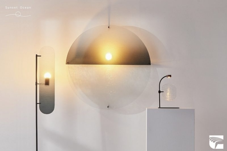 There are three lamps in this series: “Sparkling Ocean” (the right one) presents ocean waves sparkling through different angles of light irradiation on the glass; “Gradient Sky” (the left one) uses gradient patterned glass to change the brightness of the lamp while moving the light, presenting the scene of the sunrise and sunset. “Sunset Ocean” (the middle one) through the reflection and refraction of light on glass to create a whole scenery of the sunset at the seaside.