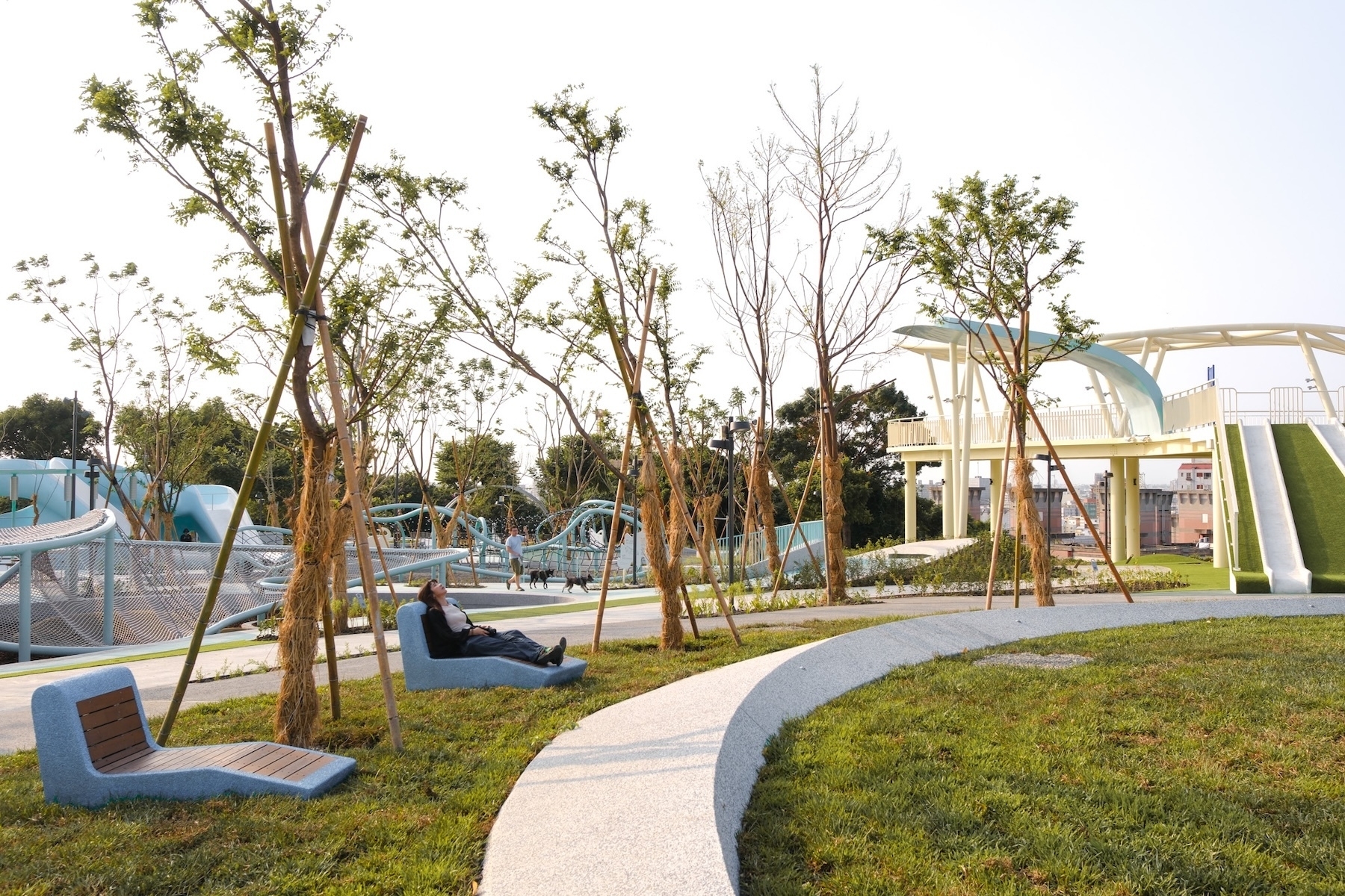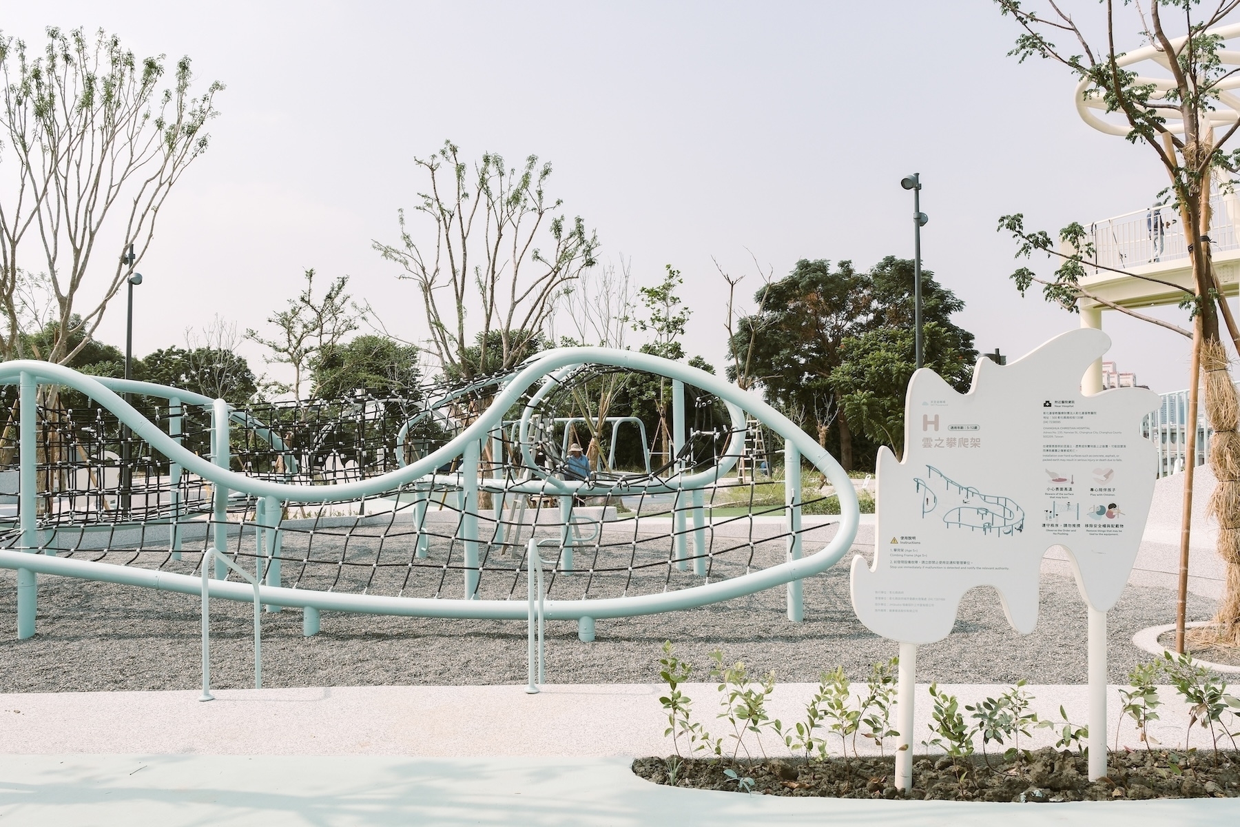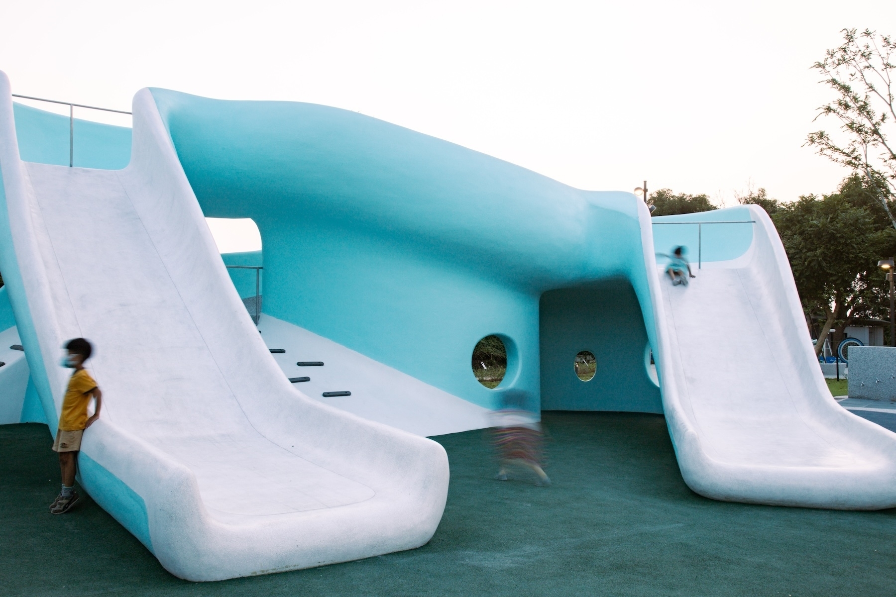 The turquoise pavement glimmers under sunlight, and the curved play structures ripple like moving clouds. Seen from afar, the site resembles a mountaintop artwork — a joyful playground that has become a new landmark for Changhua.