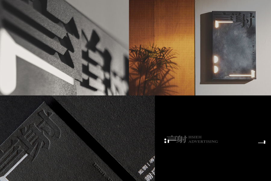 「言射廣告」以創辦人留學時期筆名為名,延續自由揮灑的創作精神。視覺識別以「凝聚論述、加以傳播」為核心,取標點符號作為概念,將「言」字中的「口」張開為括弧,象徵創意無限的發散空間。括弧造形在各式應用中皆可靈活延展。名片以黑色義大利紗蘿紙搭配壓凹字體,呼應鉛字印刷質感;招牌採鐵材酸蝕後洗刷呈現斑駁效果,展現品牌優雅卻不羈的設計態度。