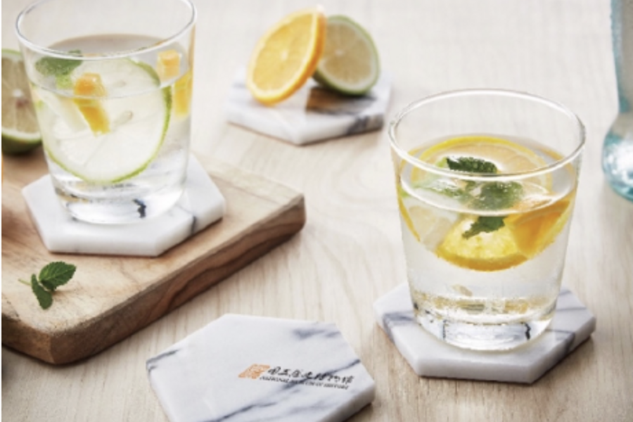 多邊形杯墊:本設計延續圓形杯墊概念,石材透過研磨後改以六邊形方式呈現不同趣味,並實現堆疊以及延伸的方式,讓使用上更具趣味性。