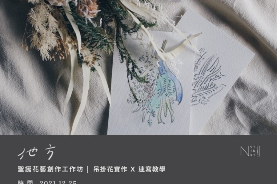 因應這次展覽主題與回憶和旅⾏有關,所以希望在展場營造出⼀種好像置⾝某個他⽅,卻⼜像在夢中情境的氛圍。今年聖誕節,不只是圖書館邀請TFC團隊帶領學員們進⾏聖誕吊掛花創作,接著由創作者徐世賢進⾏第⼆階段的速寫教學,帶領學員將畫作⼩卡和花藝作品合為一體,創作屬於自己的獨一無而畫/花作,展期間與設計師共同展出圖書館!