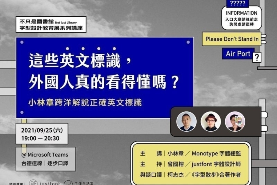 本活動榮幸邀請Monotype字體總監小林章跨洋線上分享,目前定居於德國的他擁有豐富字體設計經驗,將從設計面輔以大量常見錯誤案例與修正法,帶我們從各類型的公共空間領域,探索英文標識的多元應用,真正理解如何才是易於辨識又正確的字型作品。