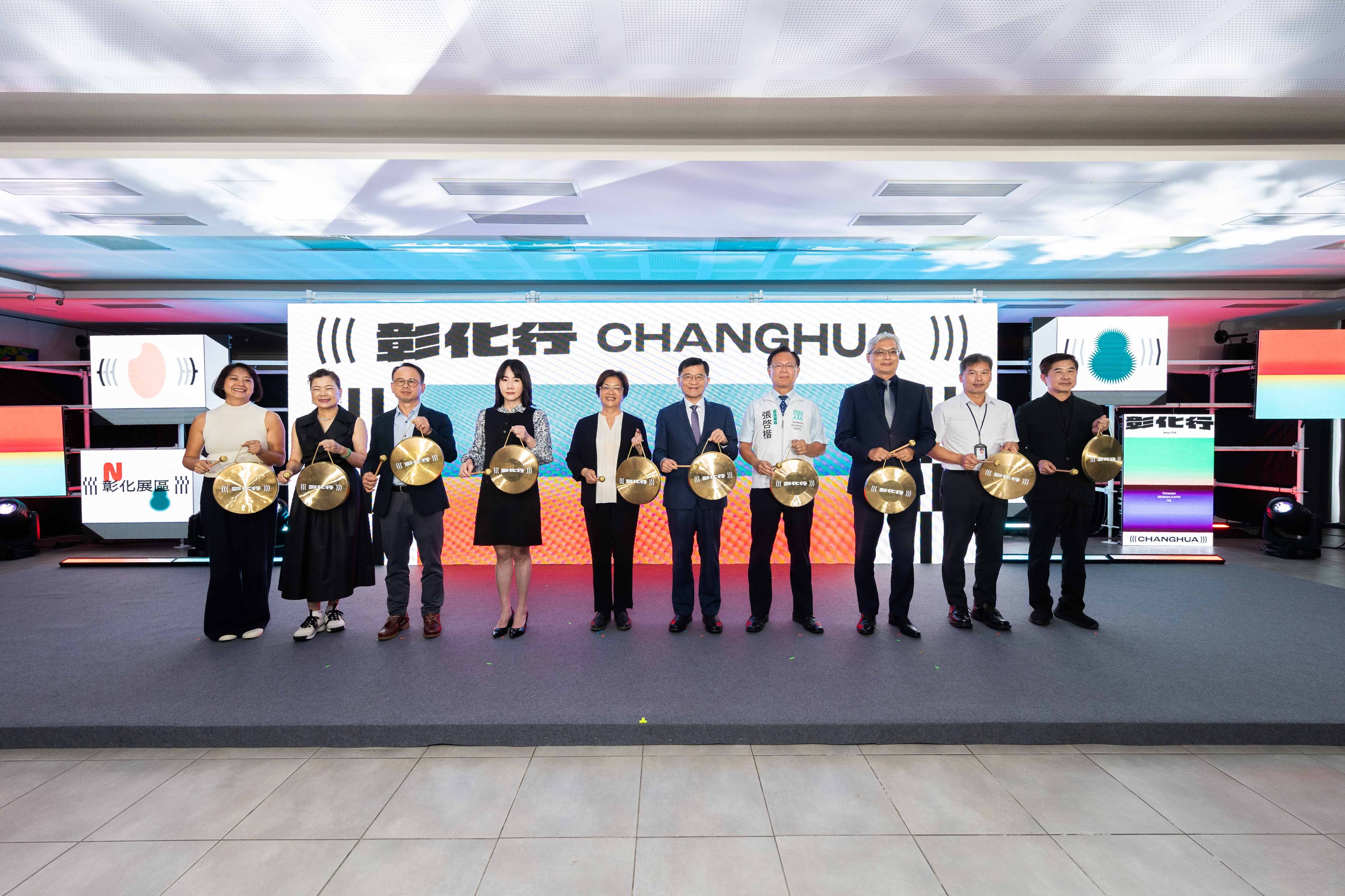 ▲ (左起)衍序規劃設計顧問有限公司劉真蓉總監、台新金控王美花獨立董事、彰化縣議會陳三民祕書長、謝衣鳯立法委員、彰化縣政府王惠美縣⻑、經濟部經濟部何晉滄次長、張啟楷立法委員、經濟部產業發展署鄒宇新副署⻑、國營台灣鐵路股份有限公司中區營運處李瑞欽處長、台灣設計研究院張基義院長共同敲響銅鑼,宣告今年台灣設計展「彰化行」正式開張。
