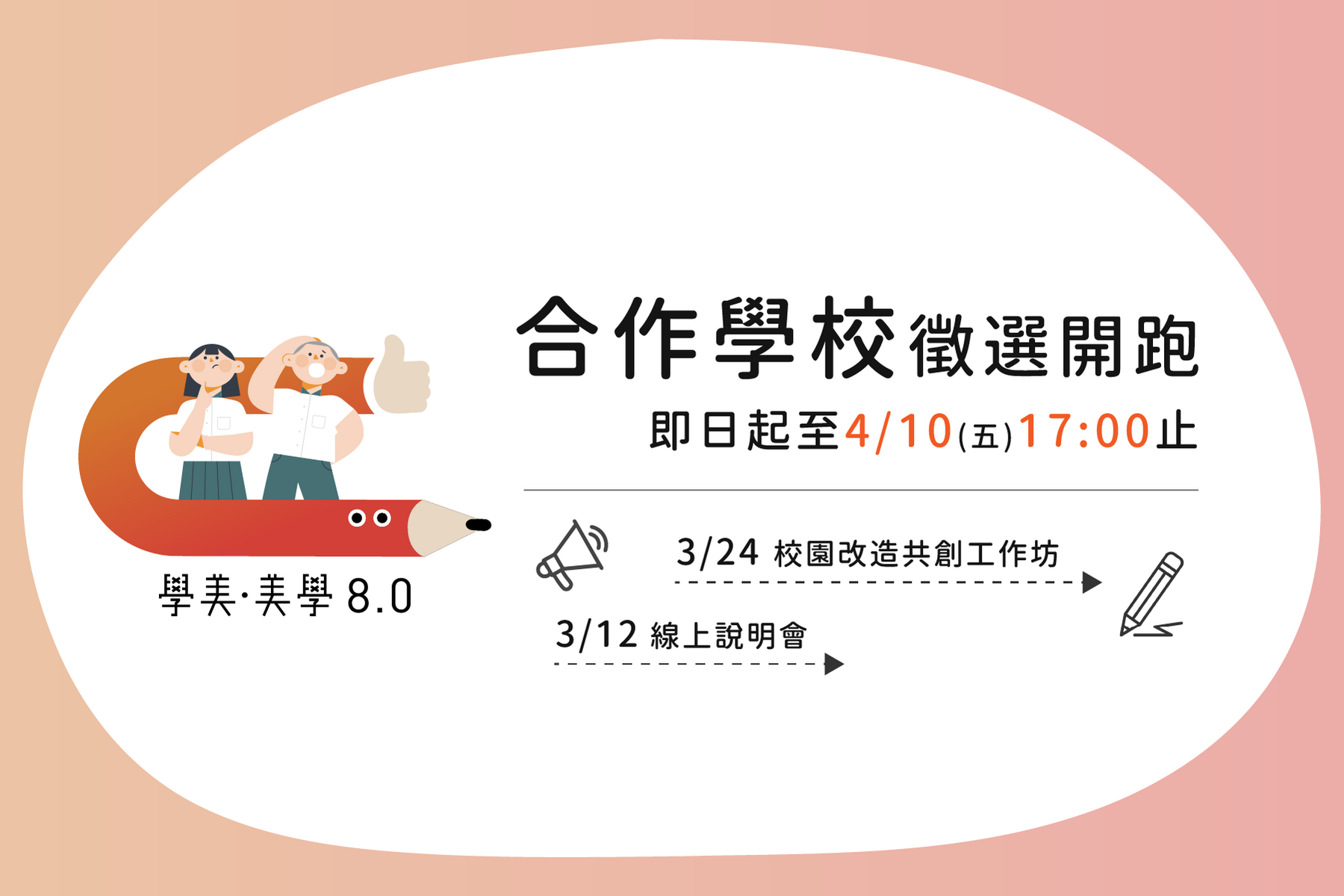 「學美.美學」計畫即日起開放設計提案收件至114年12月19日(五)中午12:00止,參與徵選之設計團隊可針對公告之17間學校改造標的提出設計提案。歡迎加入我們,一起以設計之力,為校園注入新的美感與教育能量,共同打造兼具學習與創造力的美感場域。