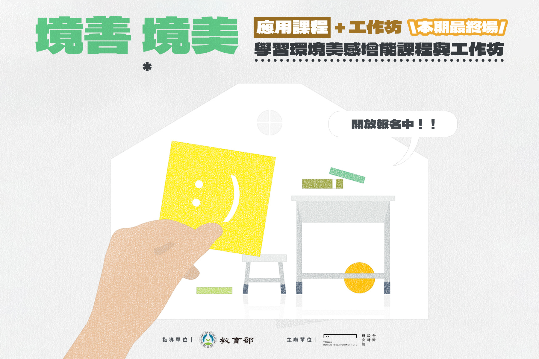 廣受好評的「境善・境美 學習環境美感增能系列課程」於今年深耕再進,開辦應用課程!誠邀持續關注校園美感營造的教師及相關學校行政人員,把握最後機會立即報名。