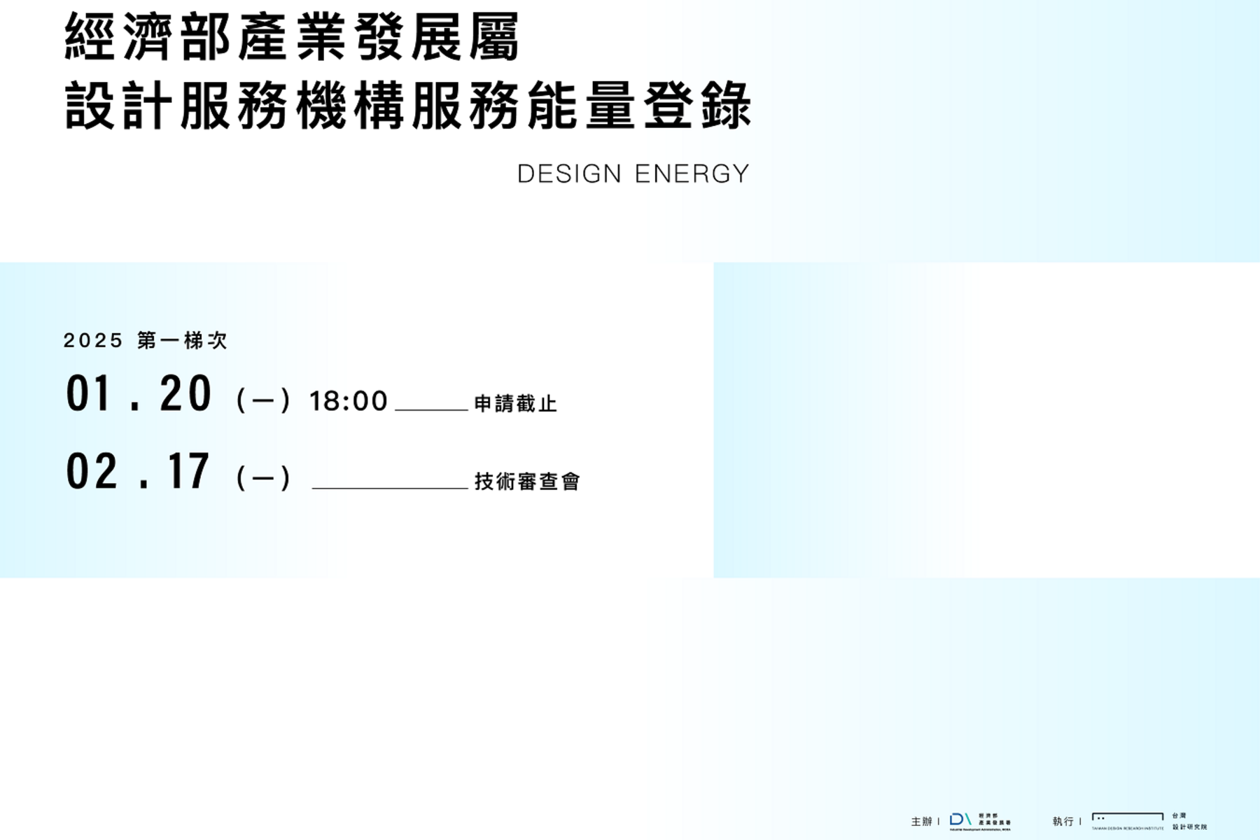 「設計服務業能量登錄」由台灣設計研究院執行審查會,經濟部工業局認證之台灣國內優良之設計服務業者。通過認證後,享有經濟部委辦相關計畫及本院設計輔導計畫優先建議名單。歡迎報名說明會活動,進一步了解如何使用線上申請平台!